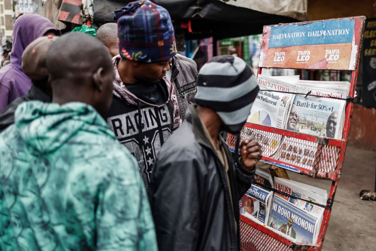 اشخاص يقرأون عناوين صحف معروضة في كشك في ماثاري بنيروبي (12 آب 2022، ا ف ب).