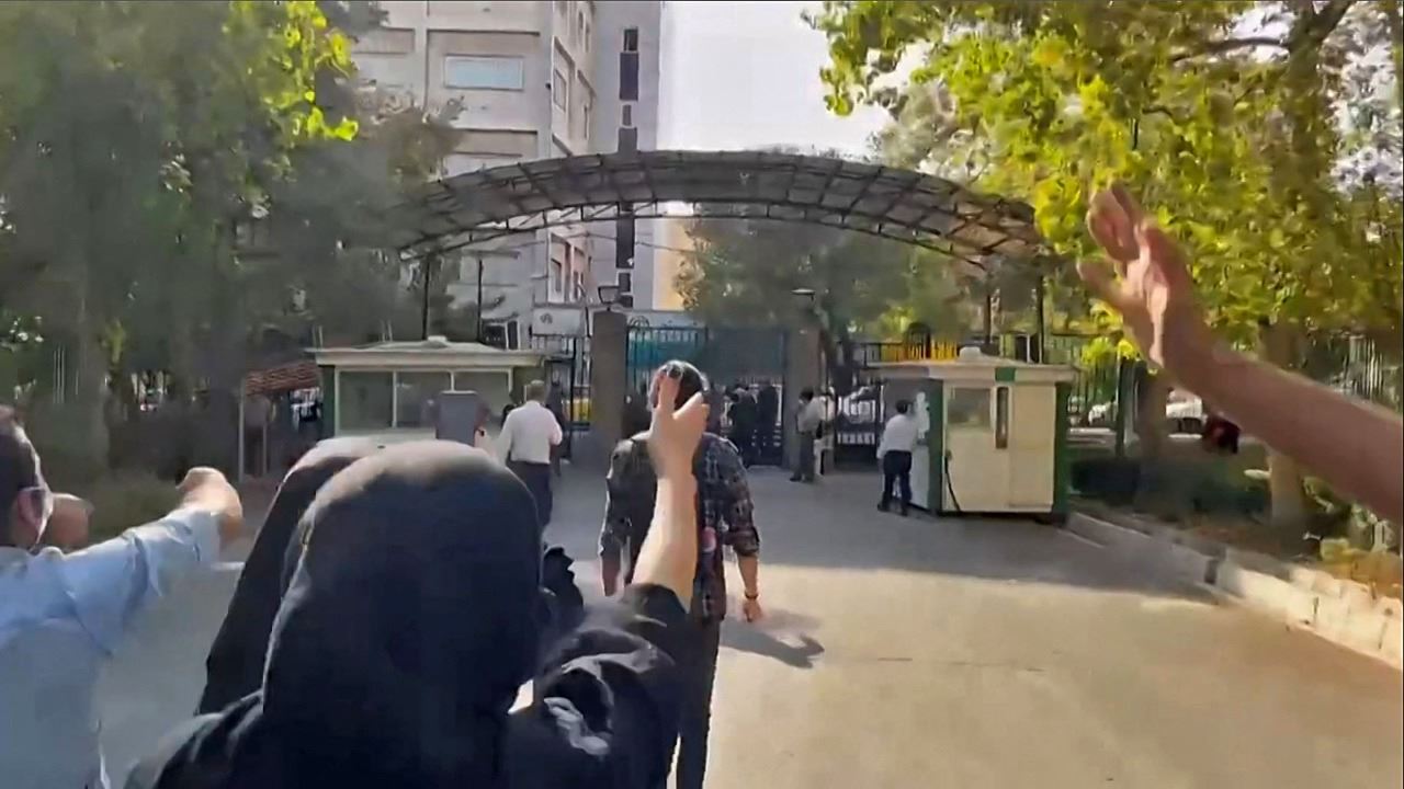 لقطة شاشة من فيديو تظهر طلابا ايرانيين في جامعة طهران وهم يصرخون على قوات الأمن الإيرانية التي تجمعت خارج بوابة الحرم الجامعي (13 ت1 2022، أ ف ب).
