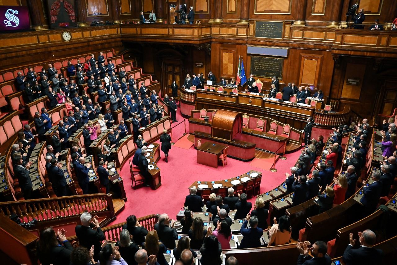 أعضاء مجلس الشيوخ الإيطالي ينتظرون بدء التصويت لانتخاب رئيس للمجلس الجديد بعد الانتخابات العامة (13 ت1 2022، أ ف ب).