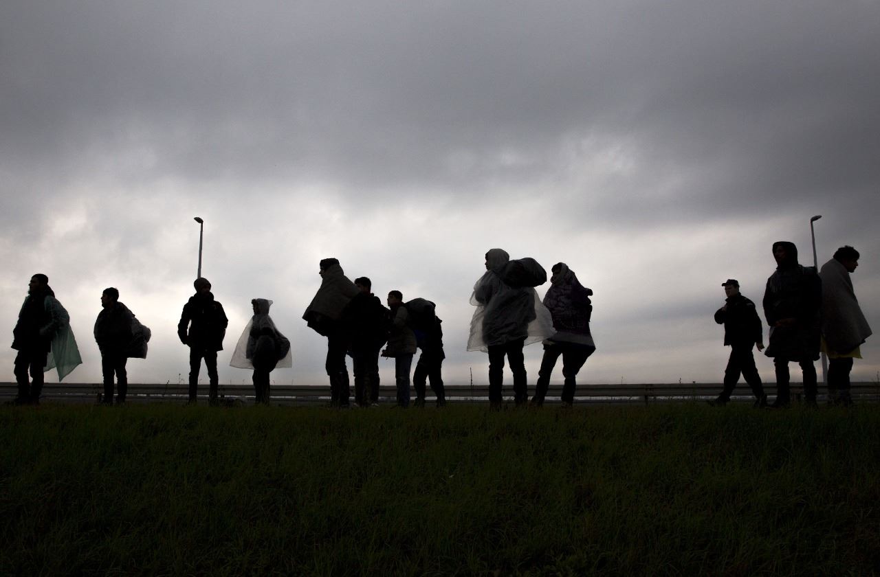 صورة أرشيفية- مهاجرون ولاجئون يمرون قرب قرية سيمانوفشي عند طريق سريع يربط العاصمة الصربية بلغراد بالحدود الكرواتية (12 ت2 2016، ا ف ب).