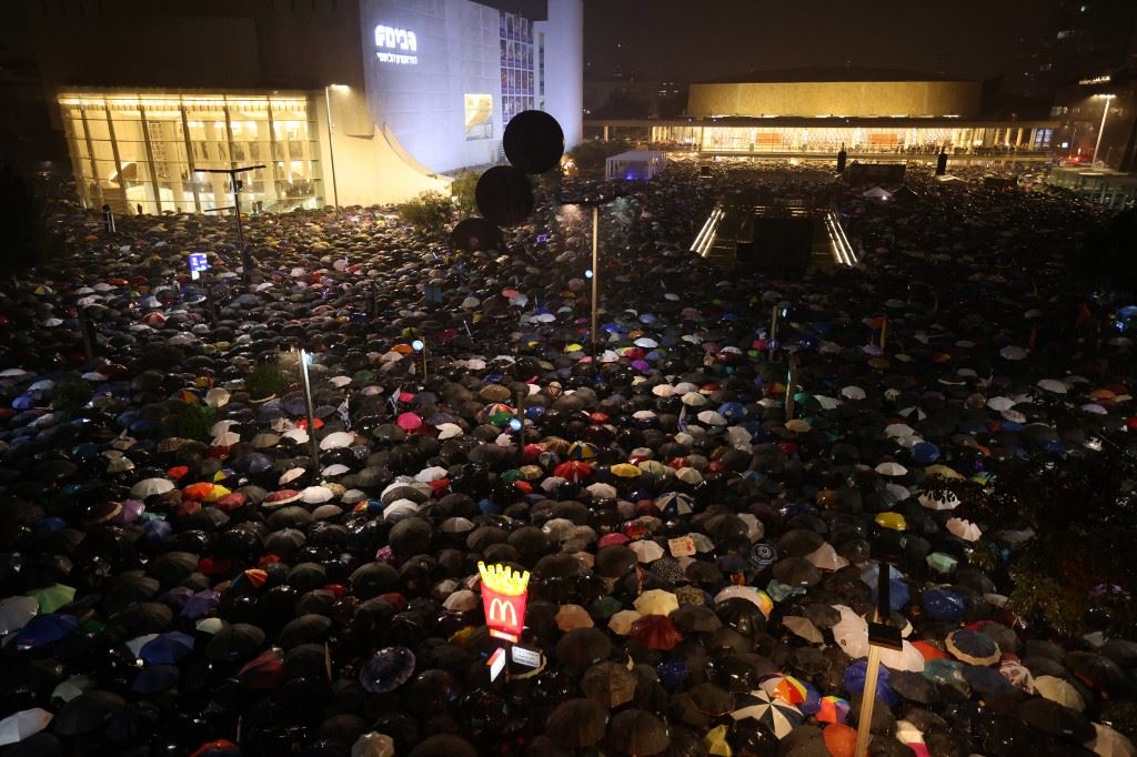 تظاهر آلاف الإسرائيليين، مساء اليوم، في وسط تل أبيب للتعبير عن رفضهم سياسة الائتلاف الحاكم الذي يضمّ أحزاباً يمينية ويمينية متطرفة وأخرى دينيّة متشدّدة يخشون أن تكون معادية للديموقراطية.