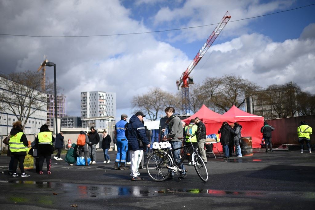 موظفون مضربون يسدون مدخل مصنع حرق في إيفري سور سين جنوب باريس احتجاجا على إصلاح المعاشات التقاعدية (14 آذار 2023، أ ف ب).