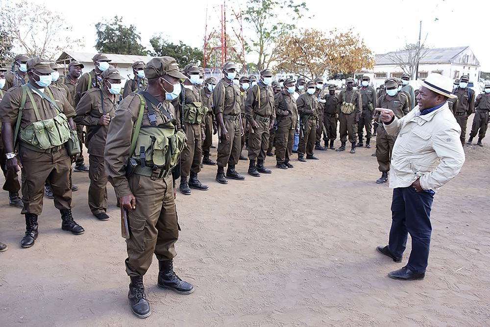 صورة ارشيفية- الرئيس فيليب نيوسي (إلى اليمين) خلال زيارته قوات الدفاع والأمن في شمال موزمبيق (9 تموز 2021، أ ب).