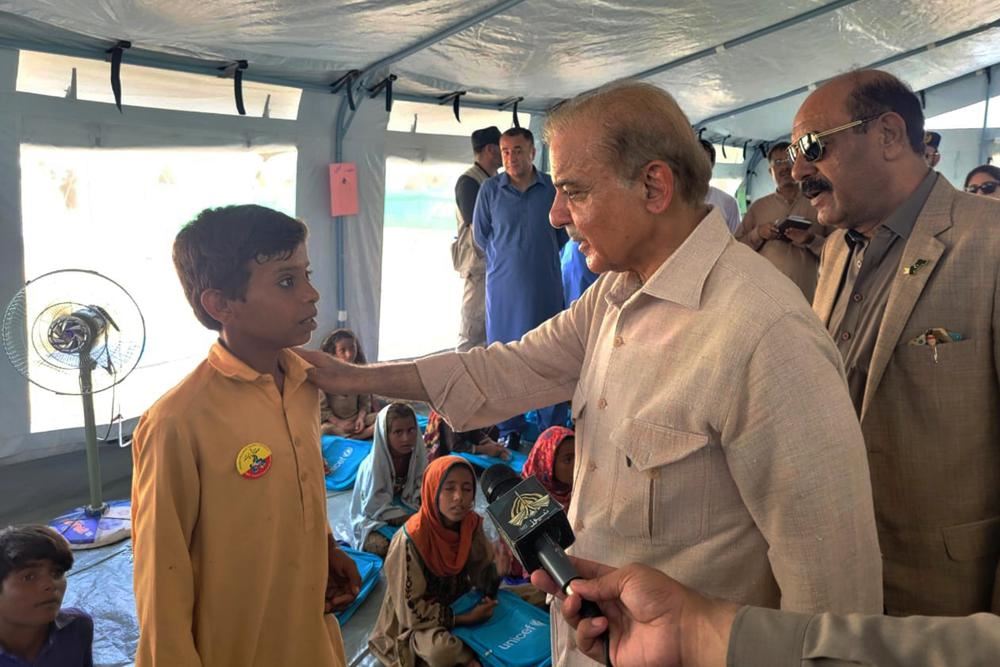رئيس الوزراء الباكستاني شهباز شريف يتحدث إلى طالب داخل خيمة في منطقة سوهباتبور التي اجتاحتها الفيضانات في بلوشستان (أ ب).