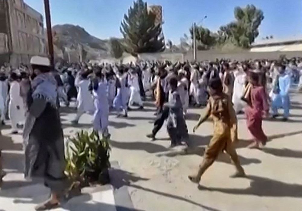 لقطة شاشة من فيديو تظهر متظاهرين إيرانيين يمشون في أحد شوارع مدينة زاهدان جنوب شرق البلاد (14 ت1 2022، أ ف ب).