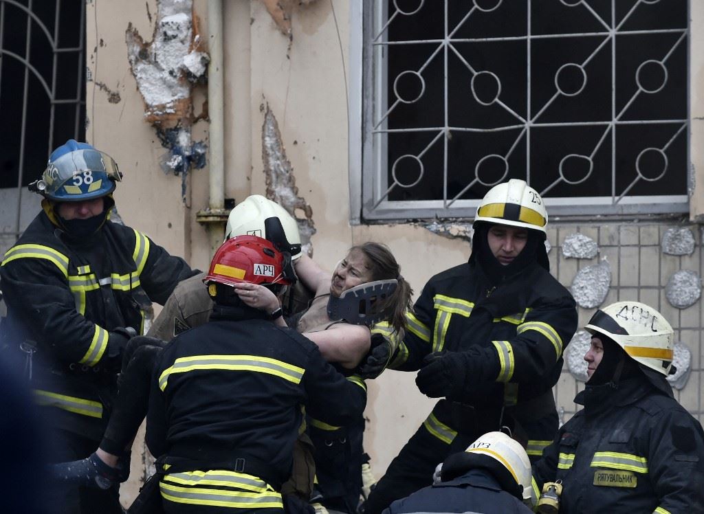 رجال إنقاذ يحملون امرأة تم انقاذها من تحت أنقاض مبنى سكني دمره قصف صاروخي في دنيبرو (15 ك2 2023، أ ف ب).