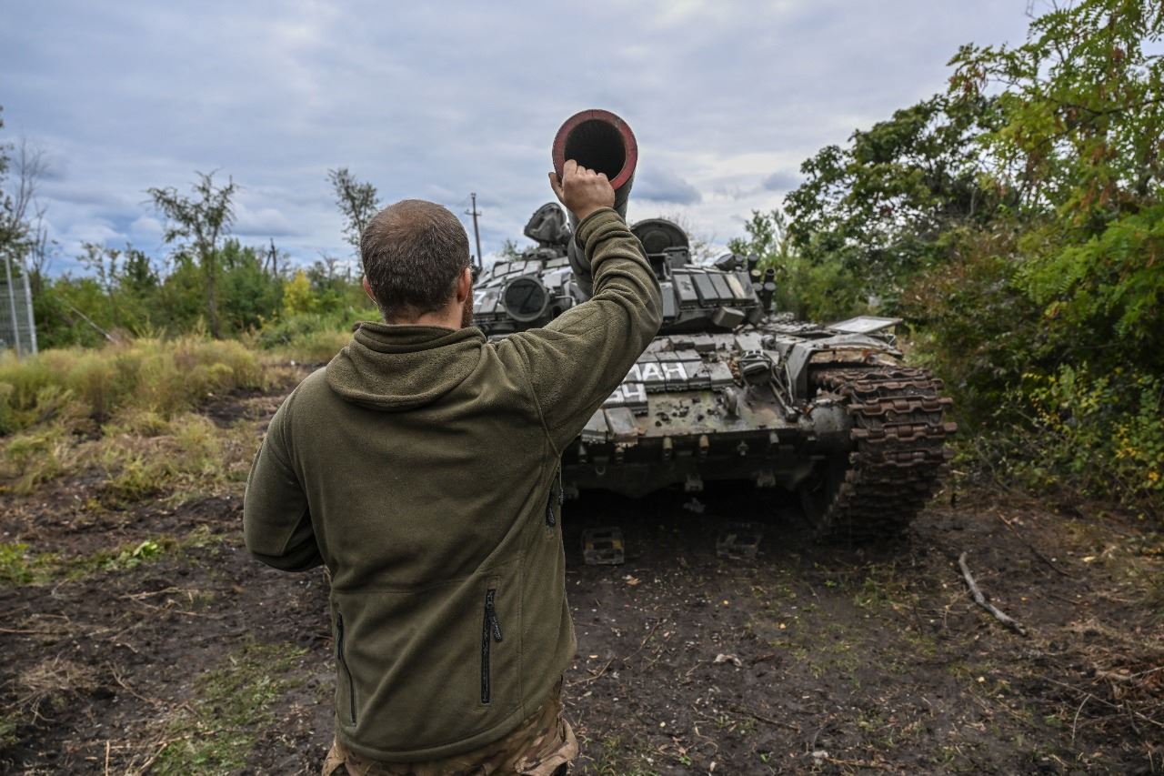 جندي أوكراني يتفقد دبابة روسية تم الاستيلاء عليها على مشارف إيزيوم بمنطقة خاركيف (14 أيلول 2022، أ ف ب).