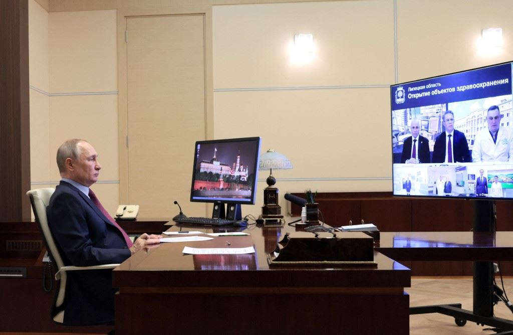 بوتين يحضر افتتاح مرافق صحية جديدة عبر الفيديو في مقر الإقامة نوفو-أوغاريوفو الحكومي خارج موسكو (15 شباط 2023، أ ف ب).