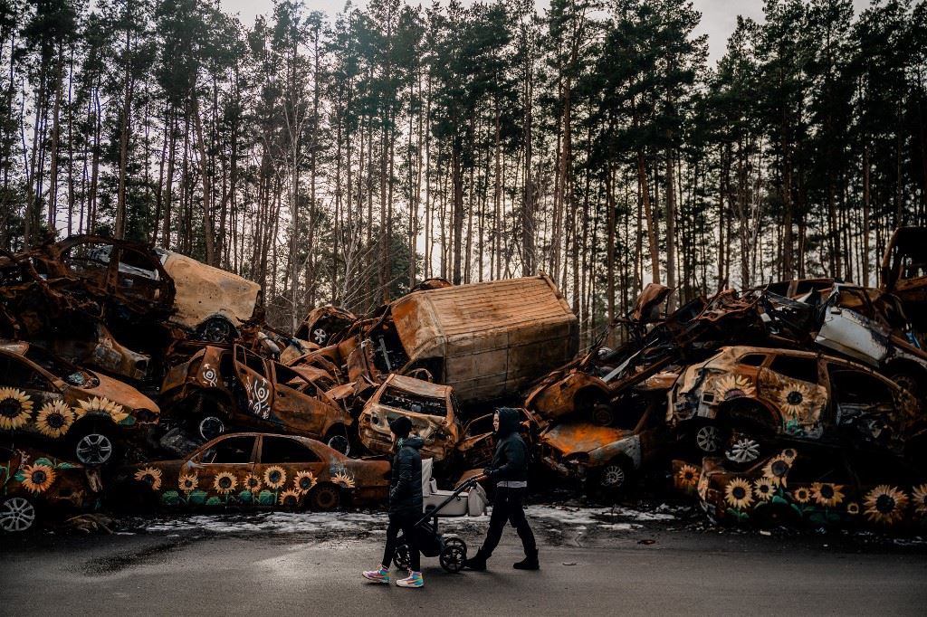 امرأة تمر قرب مقبرة سيارات مدنية متضررة في بلدة إيربين قرب كييف (16 شباط 2023، أ ف ب).