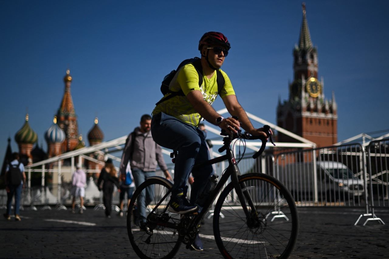 رجل يمر بدراجته في الساحة الحمراء قرب برج سباسكايا وكاتدرائية القديس باسيل في وسط موسكو (7 حزيران 2022، أ ف ب).
