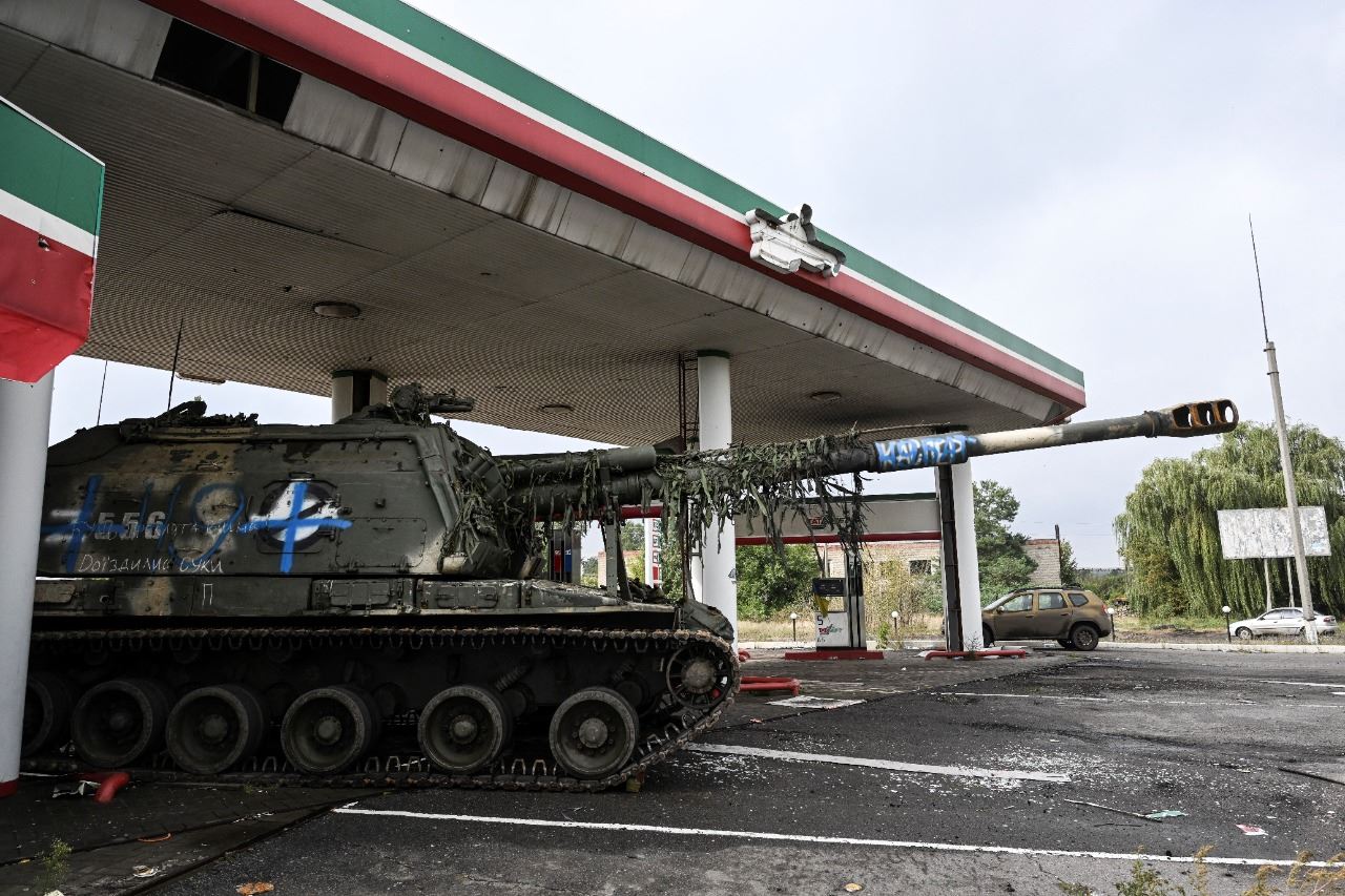 دبابة روسية مهجورة في محطة وقود على مشارف إيزيوم في منطقة خاركيف شرق أوكرانيا (16 أيلول 2022، أ ف ب).