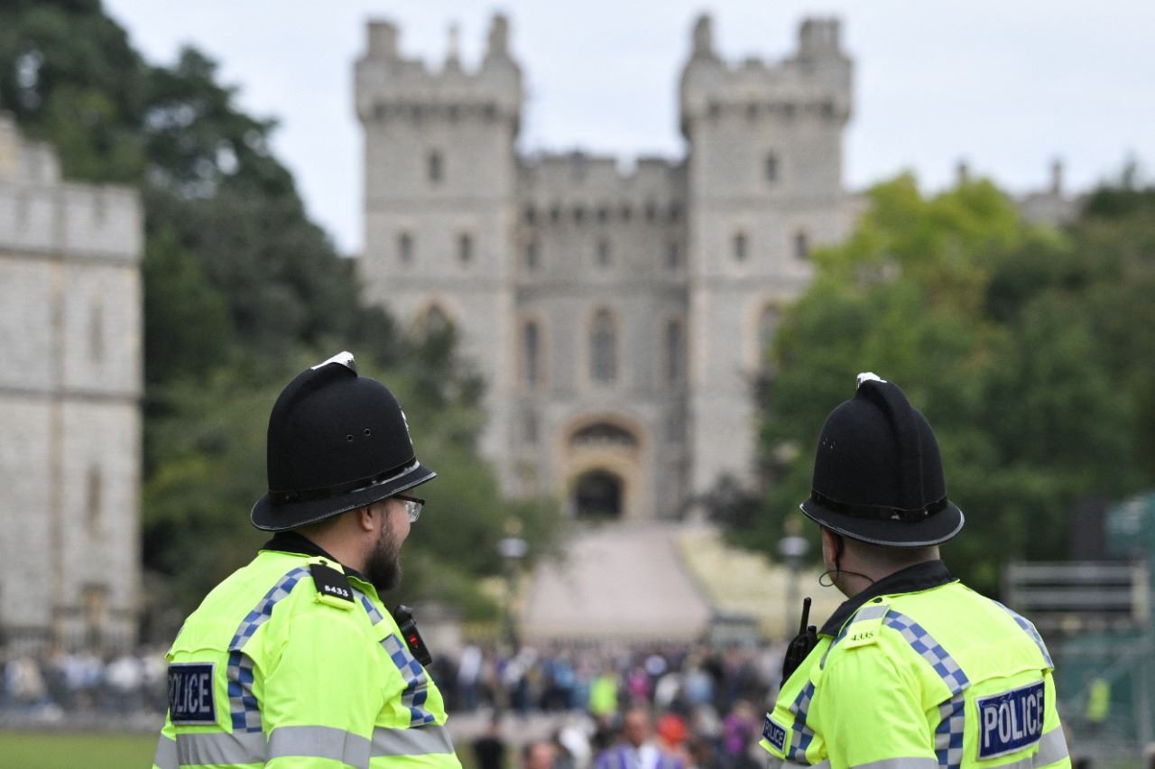 عنصران من الشرطة يراقبان بينما تجمع اشخاص في قلعة وندسور غرب لندن (15 أيلول 2022، أ ف ب).