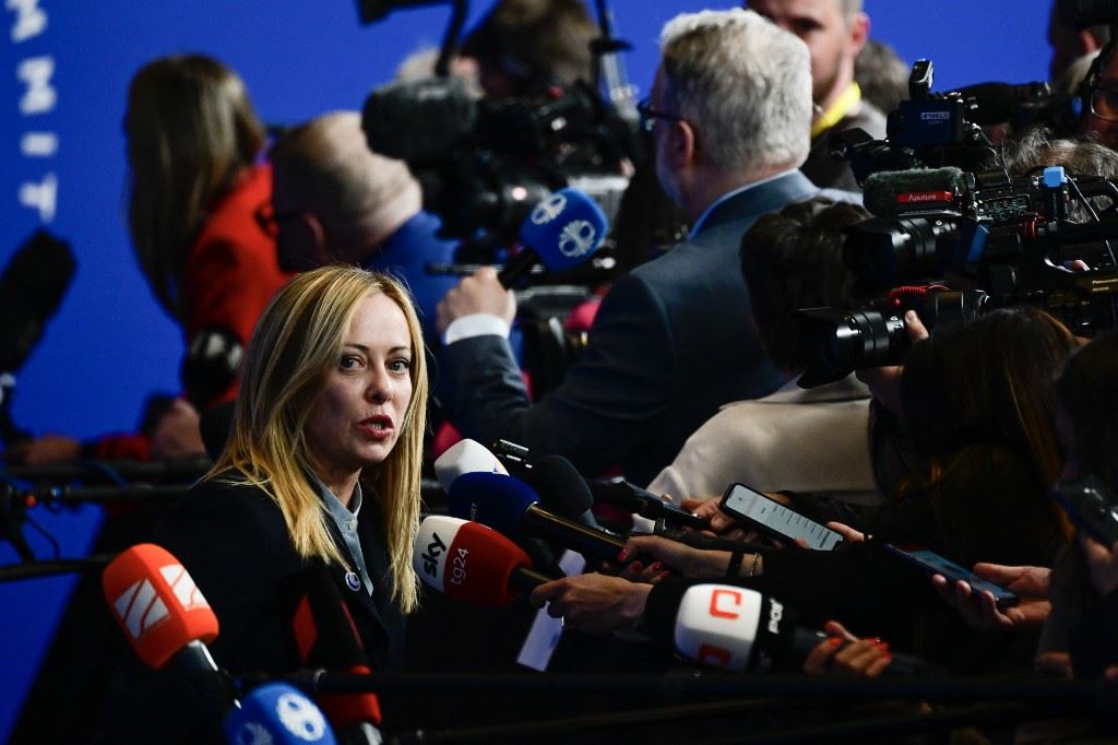 ميلوني (الى اليسار) مصرحة لدى وصولها لحضور القمة الرابعة لقادة دول مجلس أوروبا في ريكيافيك بآيسلندا (16 أيار 2023، ا ف ب).