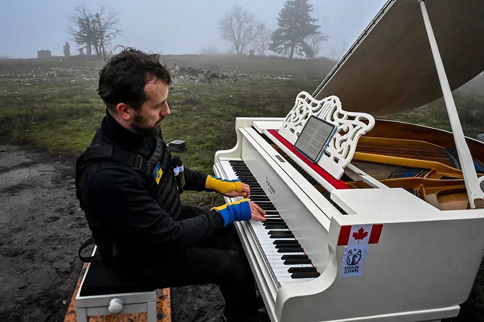 الصورة الثامنة: تظهر عازف البيانو الليتواني داريوس مازينتاس يعزف موسيقى للملحن الأوكراني فالنتين سيلفستروف، على جبل كريمينتس في إيزيوم، منطقة خاركيف شرق أوكرانيا، وهي منطقة تم تحريرها مؤخراً من القوات الروسية.