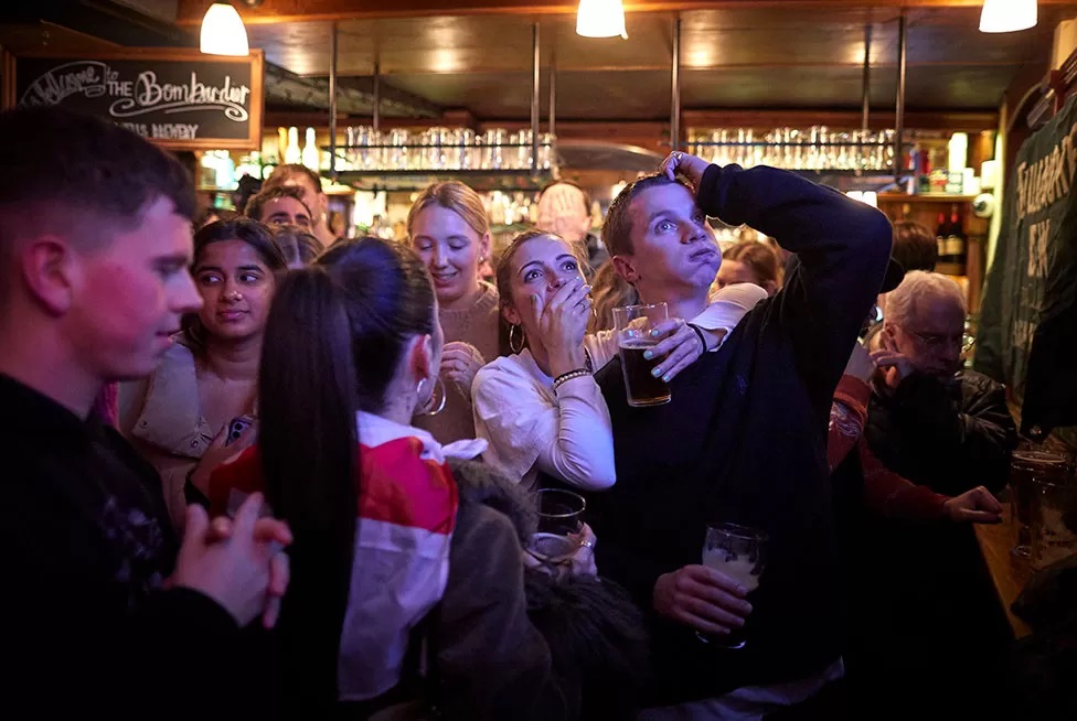 الصورة الثانية: في احد ملاهي باريس الليلية (بومباردييه بار) وتظهر ردّة فعل مشجعي كرة القدم الإنكليزية على ركلة الجزاء الضائعة من هاري كين خلال مباراة ربع نهائي كأس العالم بين فرنسا وإنكلترا. وقد فازت فرنسا في تلك المباراة على إنكلترا 2-1 في مونديال قطر، مما أخرجها من البطولة.