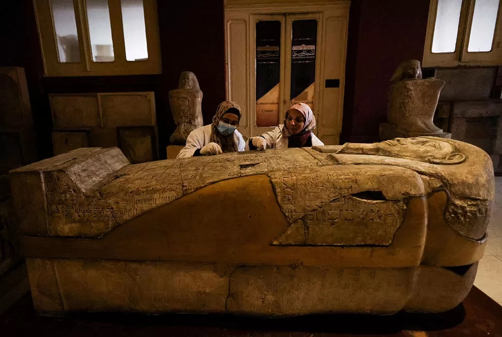 الصورة الثالثة: علماء آثار يفحصون تابوتًا داخل المتحف المصري بالقاهرة.