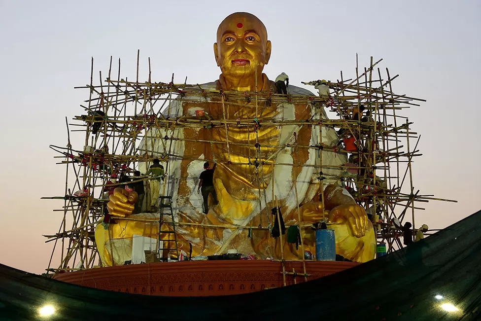 الصورة العاشرة: إضافة اللمسات الأخيرة على تمثال كبير للزعيم الهندوسي براموخ سوامي مهراج، قبل الاحتفالات المئوية على ولادته، في أرض المهرجانات في ضواحي أحمد آباد - الهند.