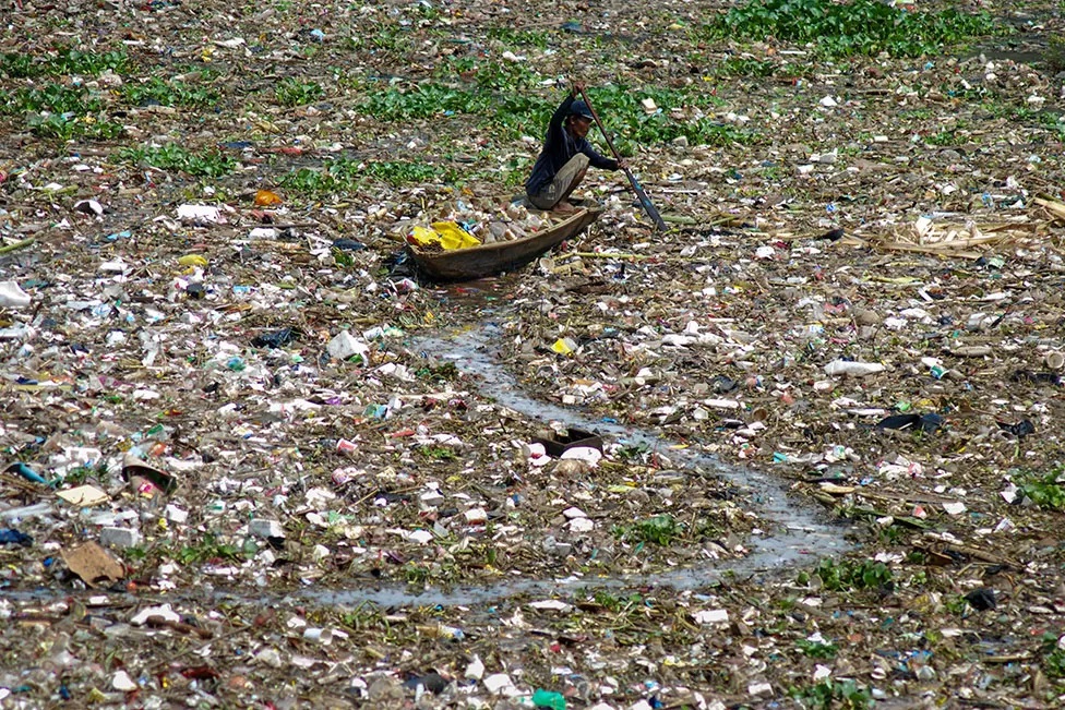 الصورة التاسعة: ربما هي صورة تدل على حجم الفقر، إذ تظهر رجلاً يجمع البلاستيك من نهر سيتاروم الملوث في ويست باندونغ، جاوة الغربية في إندونيسيا.
