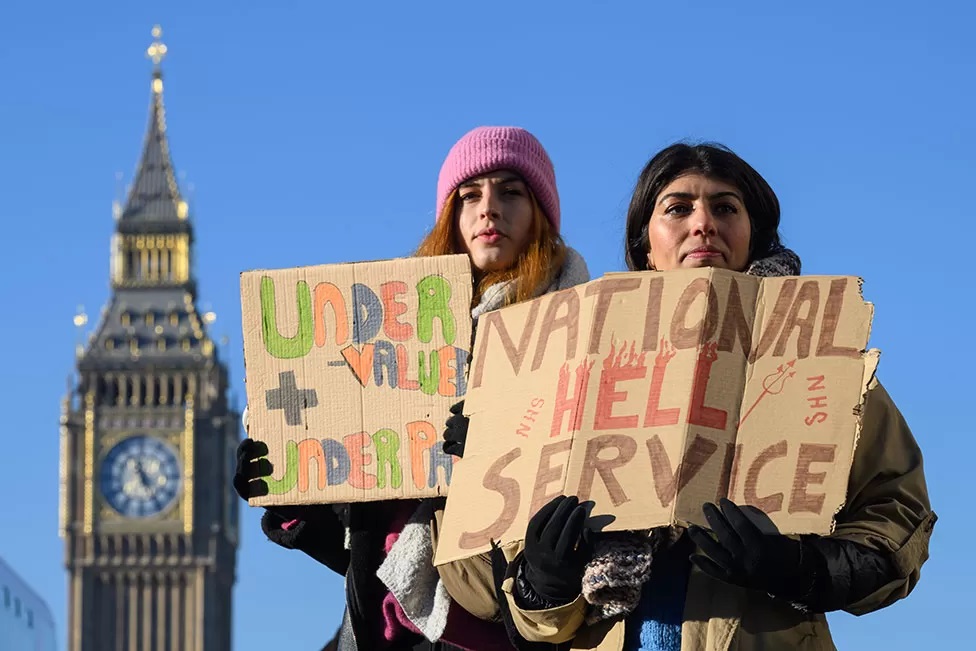 الصورة الرابعة: تظهر ممرضات مؤيدون لهم يتظاهرون خارج مستشفى سانت توماس في وستمنستر، لندن، خلال إضراب الكلية الملكية للتمريض، احتجاجاً على الأجور، وقد تضامن معهم عشرات آلاف الممرضات في جميع أنحاء إنكلترا وويلز وإيرلندا الشمالية.