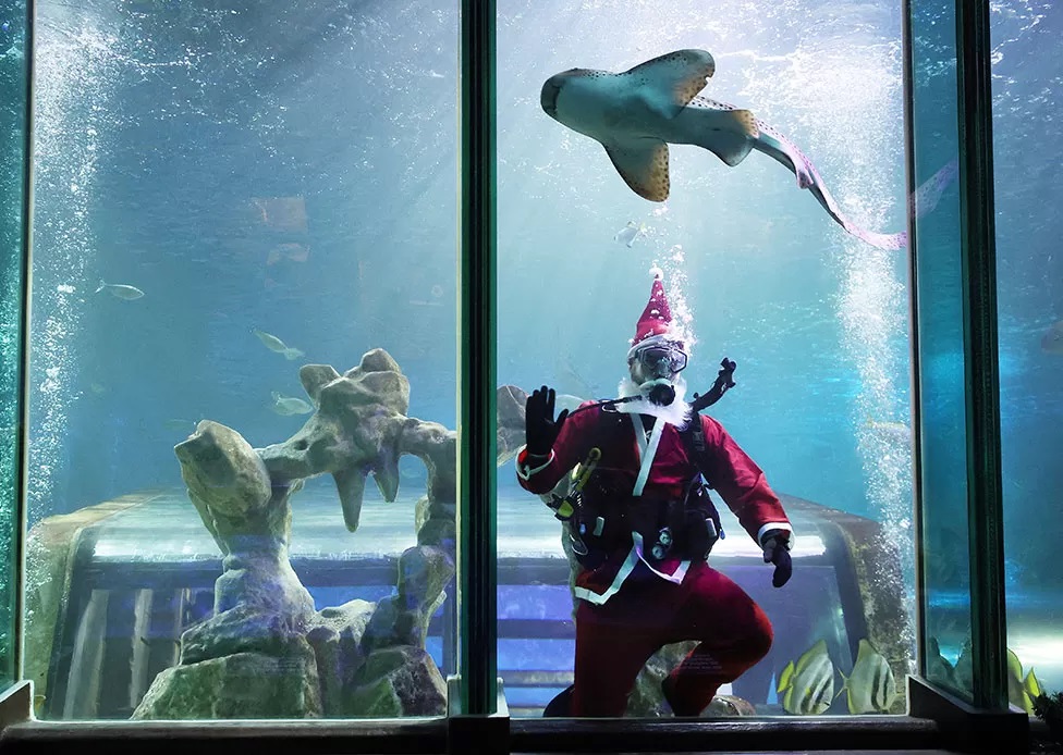 الصورة الخامسة: أحد الغواصين يرتدي زيّ بابا نويل في عرض المحيط في Sea Life في بلاكبول - إنكلترا.