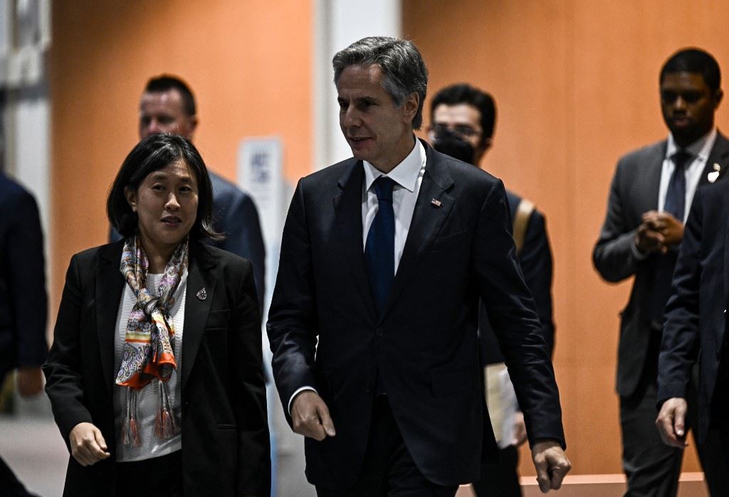 بلينكن (وسط) لدى وصوله لعقد مؤتمر صحافي خلال قمة أبيك في بانكوك (17 ت2 2022ـ أ ف ب).