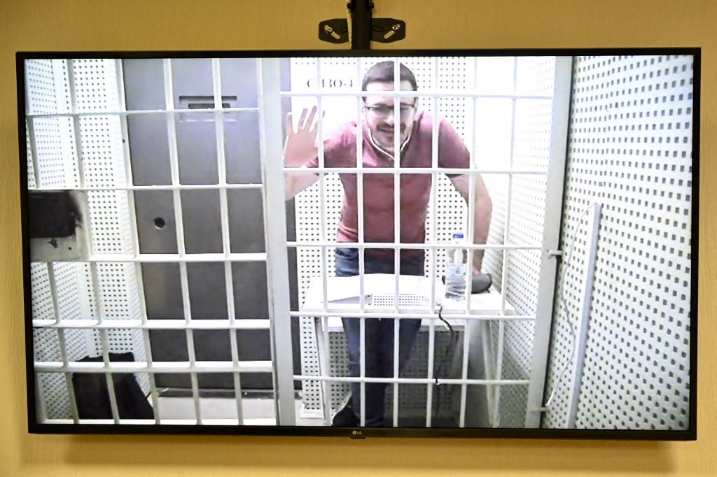 ياشين يظهر على شاشة خلال جلسة استماع للمحكمة في موسكو للنظر في استئناف حكم بالسجن ضده (19 نيسان 2023، أ ف ب).