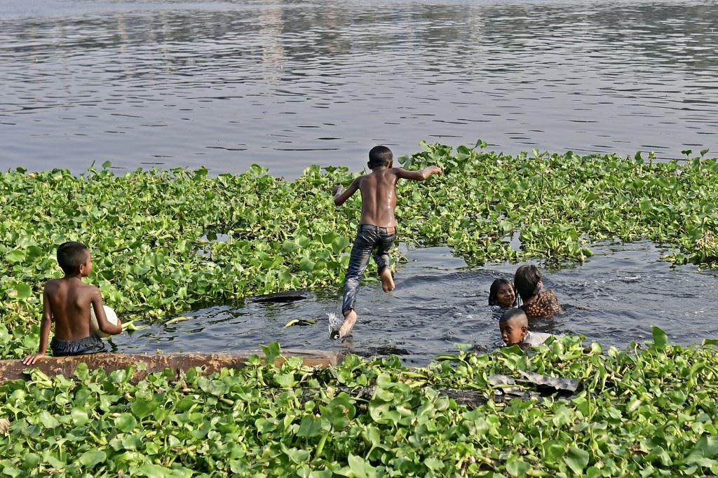 أطفال يستحمون في نهر بوريغانجا في يوم صيفي حار في دكا (19 نيسان 2023، أ ف ب).