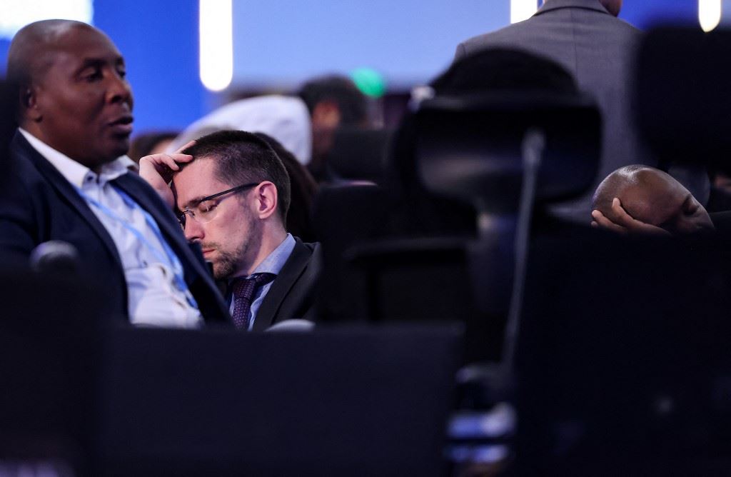 أحد المشاركين يغفو خلال الجلسة الختامية لمؤتمر المناخ في مركز شرم الشيخ الدولي للمؤتمرات في شرم الشيخ (20 ت2 2022، أ ف ب).