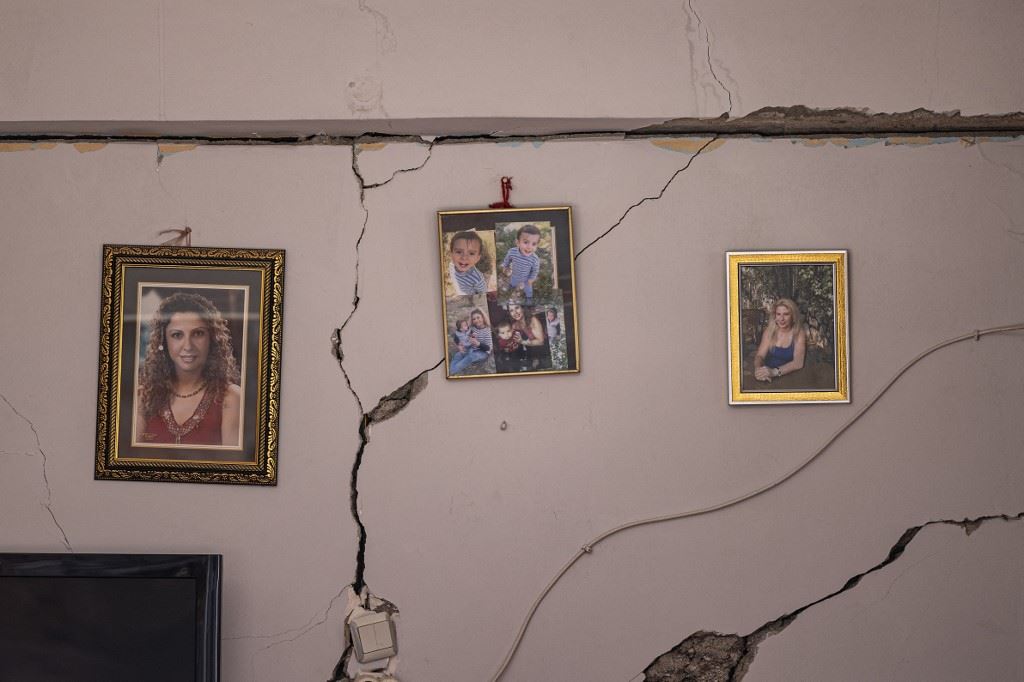 شقوق في جدار علقت عليه صور عائلية، من جراء زلزال بقوة 6.4 درجات ضرب مقاطعة هاتاي في انطاكية جنوب تركيا (21 شباط 2023، أ ف ب).