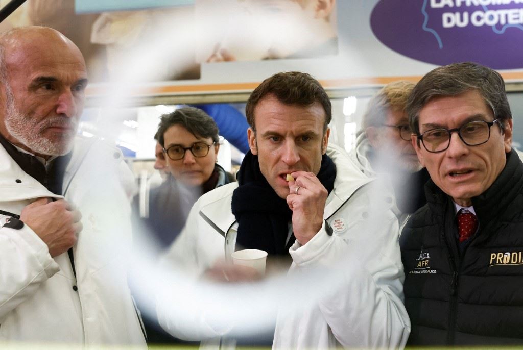 ماكرون يتذوق الجبن خلال جولة في سوق رانجيس في رانجيس، الضاحية الجنوبية لباريس (21 شباط 2023، أ ف ب).