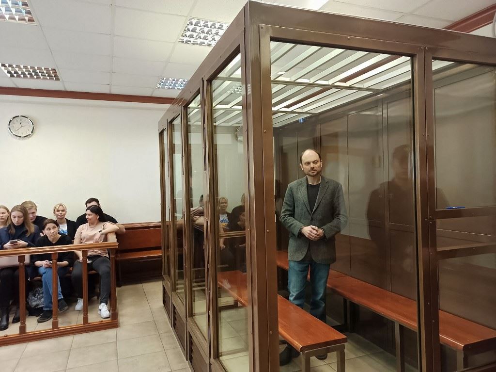 كارا- مورزا يقف داخل قفص المتهمين في محكمة مدينة موسكو في موسكو (17 نيسان 2023، أ ف ب).