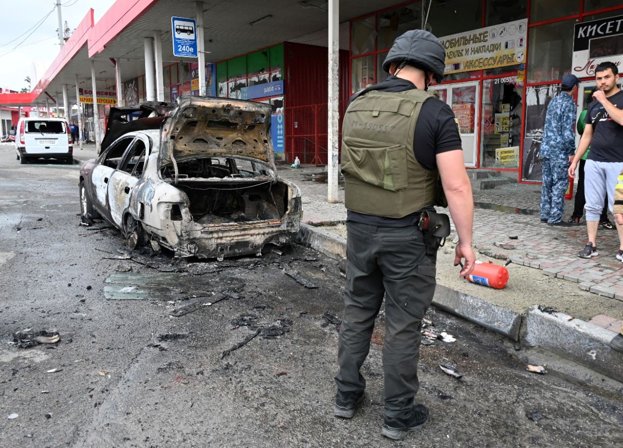 شرطي يقف بجوار سيارة محترقة بعد هجوم صاروخي روسي على حي في خاركيف الاوكرانية (21 تموز 2022، أ ف ب).