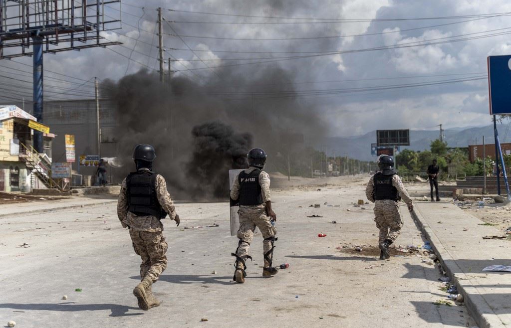 عناصر من الشرطة يحاولون إخافة متظاهرين في بورت أو برنس بهايتي في يوم جان جاك ديسالين (17 ت1 2022، أ ف ب).