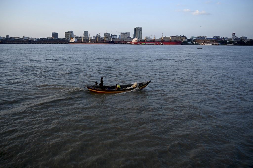 رجال يركبون قاربًا في نهر يانغون بيانغون (19 ت1 2022، أ ف ب).