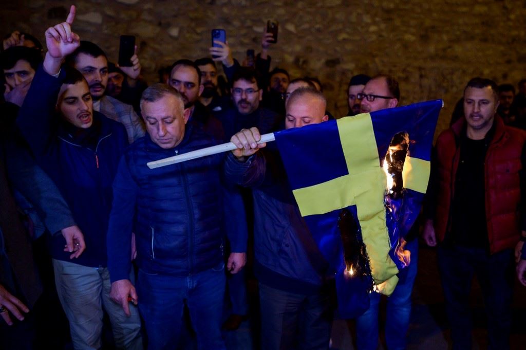 إحراق العلم السويدي في تركيا على خليفة إحراق نسخة من القرآن الكريم في ستوكهولم (أ ف ب).