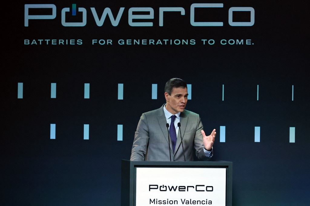 سانشيز يلقي خطابا خلال احتفال وضع حجر الأساس لمصنع بطاريات PowerCo العملاق الذي تبينه مجموعة فولكس فاغن في ساغونتو (16 آذار 2023، أ ف ب).