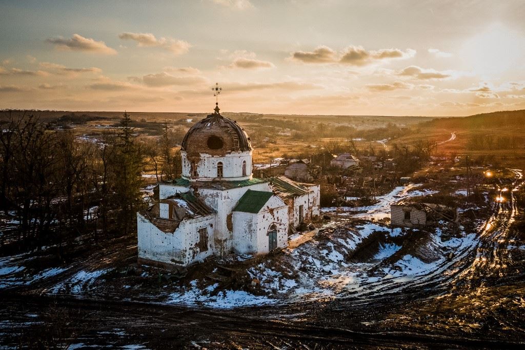 صورة جوية تظهر كنيسة مدمرة كانت القوات الروسية تستخدمها كمستشفى موقت في قرية مالا كوميشوفاخا بمنطقة خاركيف (22 شباط 2023/ أ ف ب).