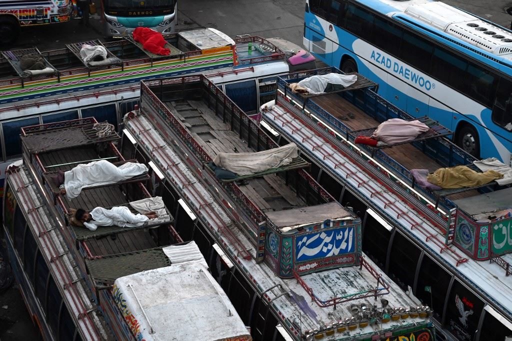 السائقون ينامون على سطح الحافلات المتوقّفة في باكستان (أ ف ب).