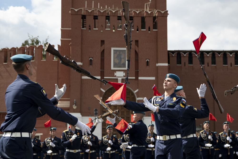 مظليون روس خلال مشاركتهم في احتفالات بيوم المظليين قرب برج سباسكايا في الساحة الحمراء في موسكو (2 آب 2022، أ ب).