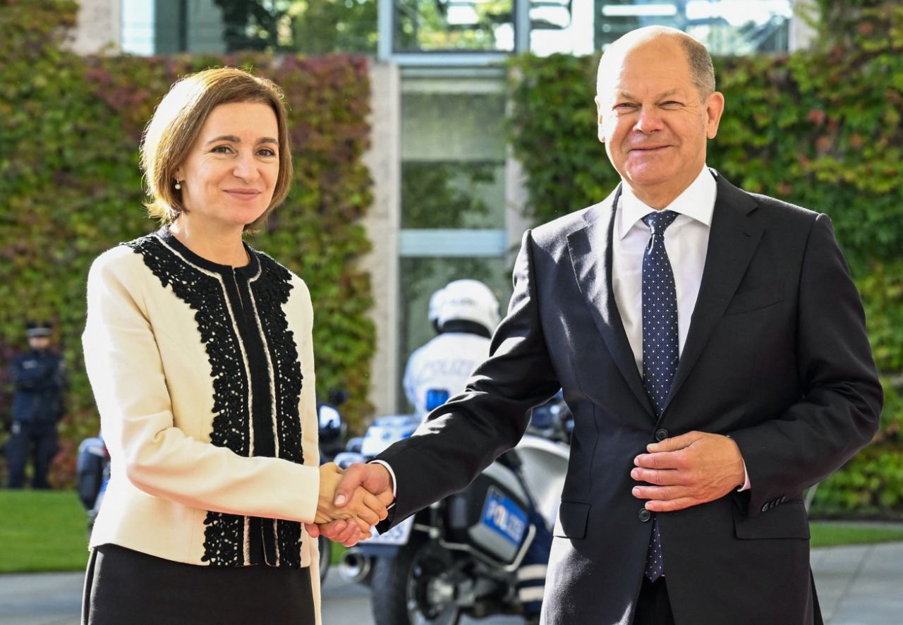 شولتس يرحب برئيسة مولدوفا مايا ساندو في فناء المستشارية في برلين (23 أيلول 2022، أ ف ب).