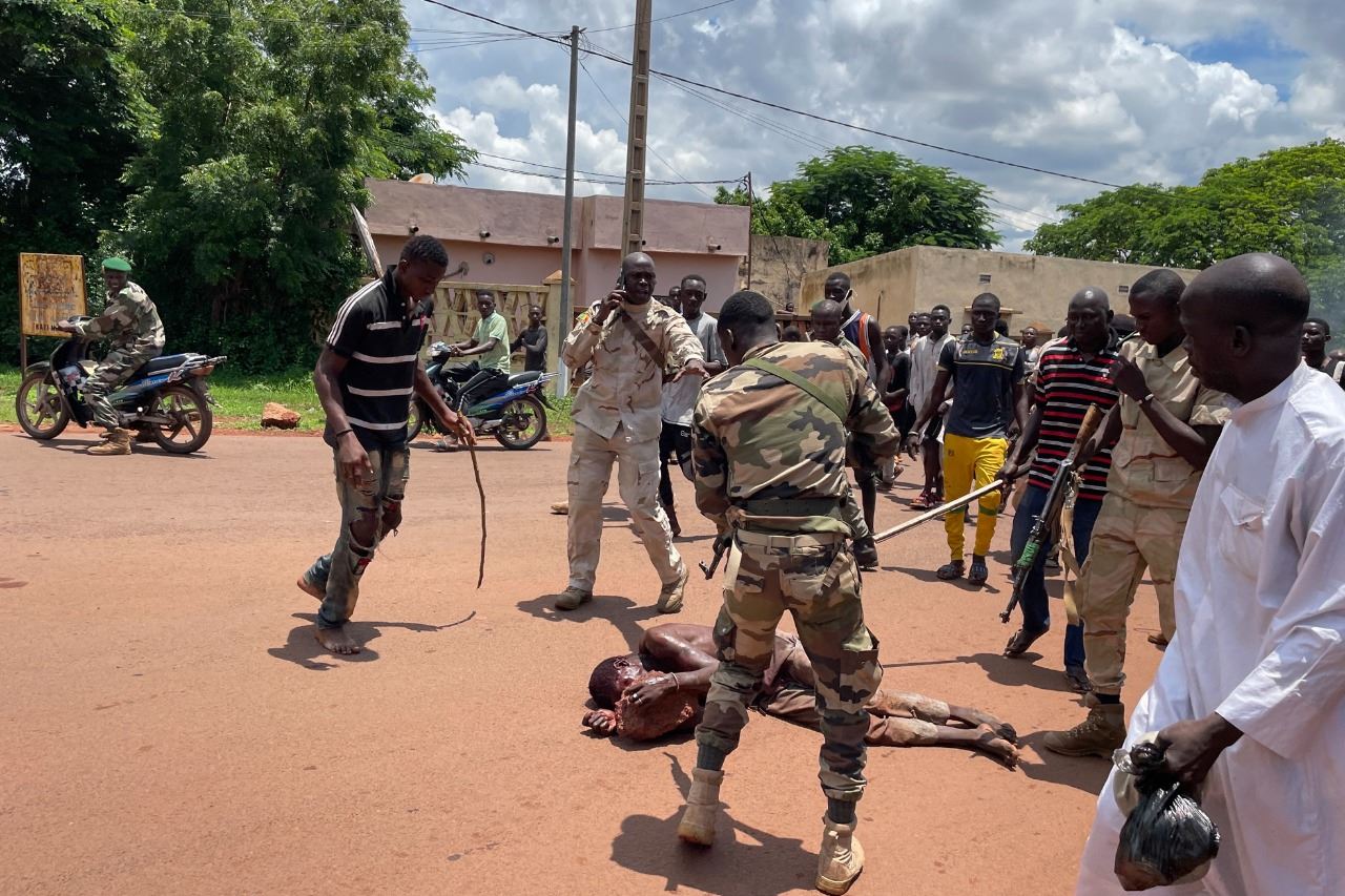 جندي يصوب بندقيته على رجل يشتبه في مشاركته في هجوم "إرهابي"، وتعرض للضرب على يد حشد، أمام قاعدة عسكرية في كاتي بمالي (22 تموز 2022، ا ف ب).