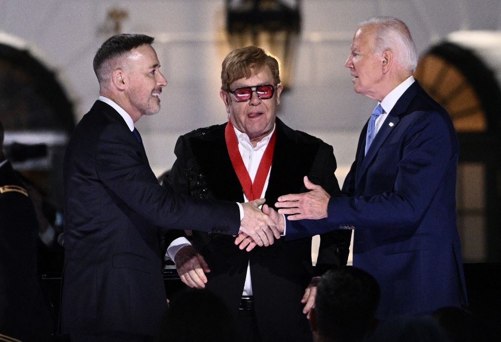 إلتون جون على خشبة المسرح مع الرئيس الأميركي جو بايدن الذي منحه وسام العلوم الإنسانية الوطنية(أ ف ب).
