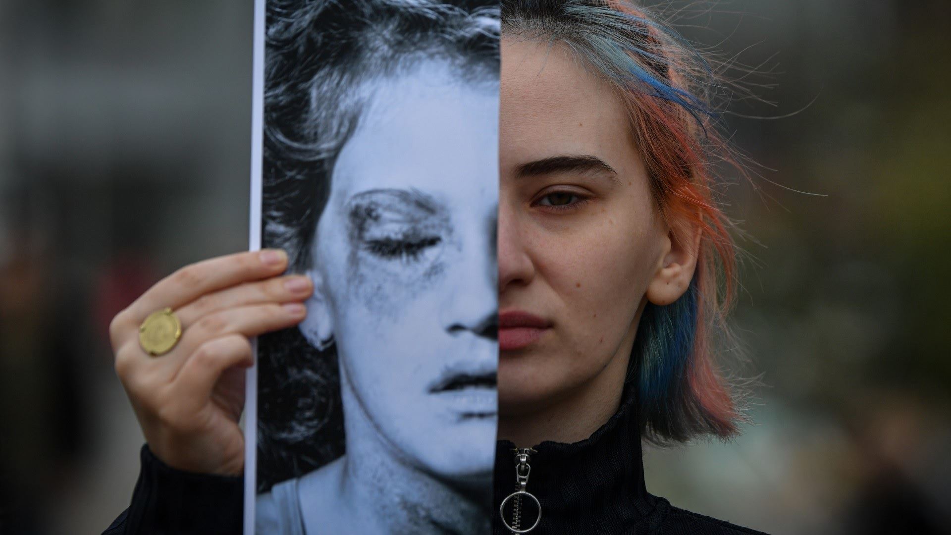 ناشطة نسويّة ترفع صورة لوجه امرأة ضحية عنف ذكوريّ خلال مسيرة في بوخارست (4 آذار 2020 - أ ف ب).