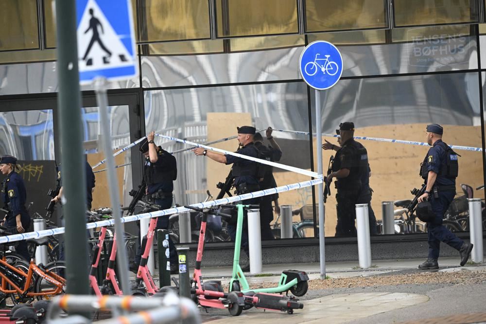 عناصر من الشرطة يصلون إلى موقع إطلاق نار في مركز تسوق إمبوريا في مالمو بالسويد (19 آب 2022، أ ب).