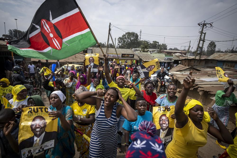 أنصار لويليام روتو يحملون ملصقات حملته خلال مسيرة في حي كيبيرا في نيروبي (5 أيلول 2022، أ ب).