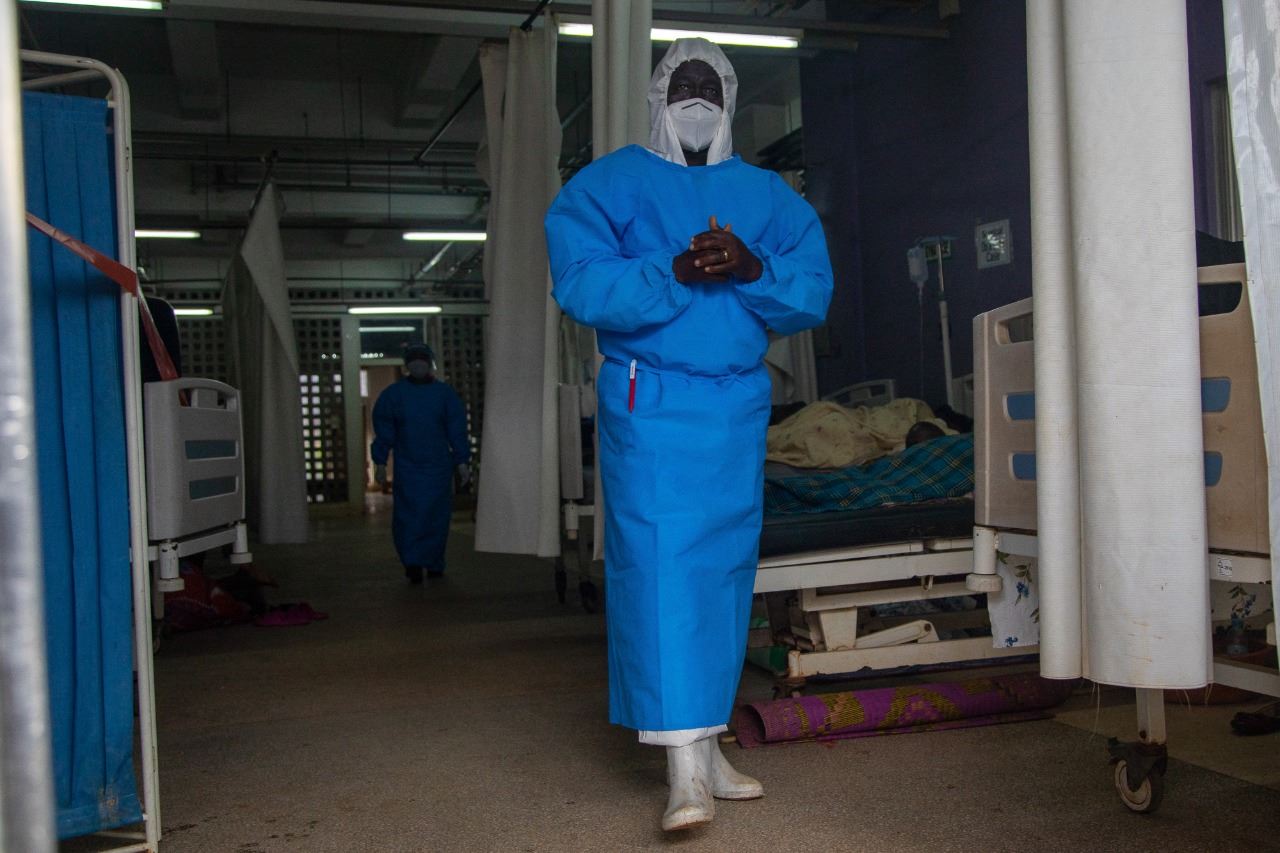 فرد من الطاقم الطبي الأوغندي في وحدة علاج الإيبولا يقف داخل الجناح في مستشفى موبيندي الإقليمي في أوغندا (24 أيلول 2022، أ ف ب).