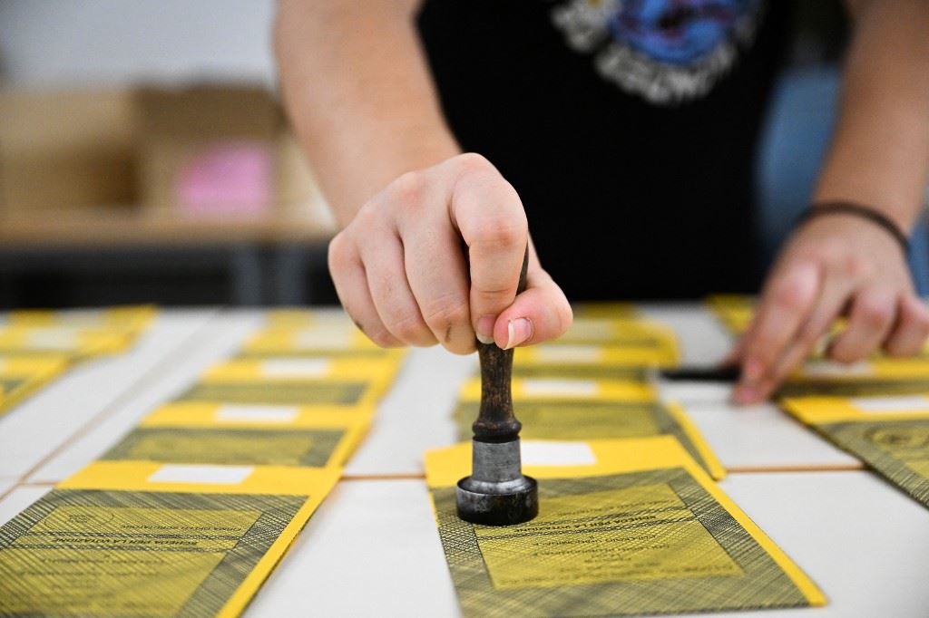 متطوعة تُعدّ أوراق الاقتراع الصفراء للتصويت في مجلس الشيوخ في 24 أيلول 2022، عشية الانتخابات التشريعية في البلاد (أ ف ب).