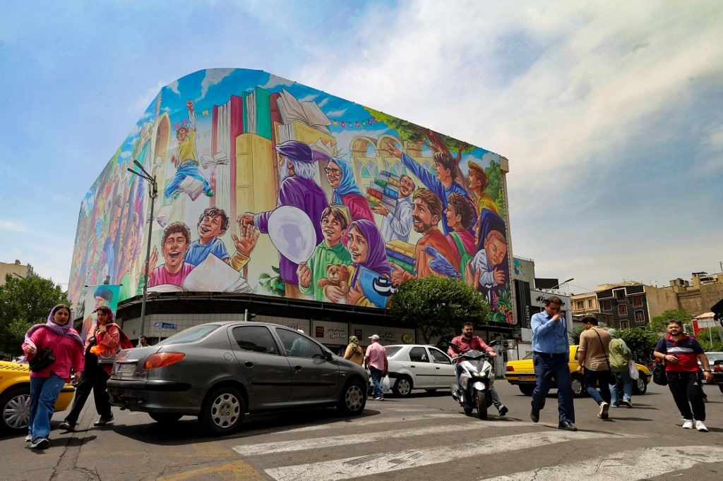 أشخاص يمرون أمام جدارية في طهران (20 أيار 2023، أ ف ب).
