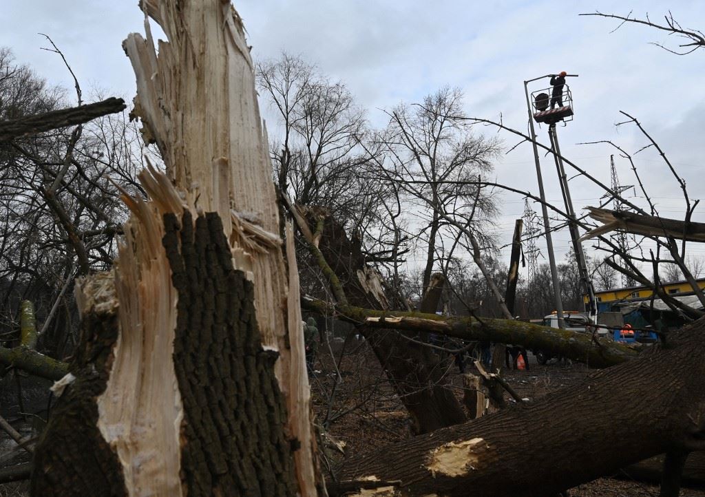 عمال يصلحون خطوط الكهرباء بعد هجوم صاروخي روسي على المنطقة الصناعية في كييف (26 ك2 2023، أ ف ب).
