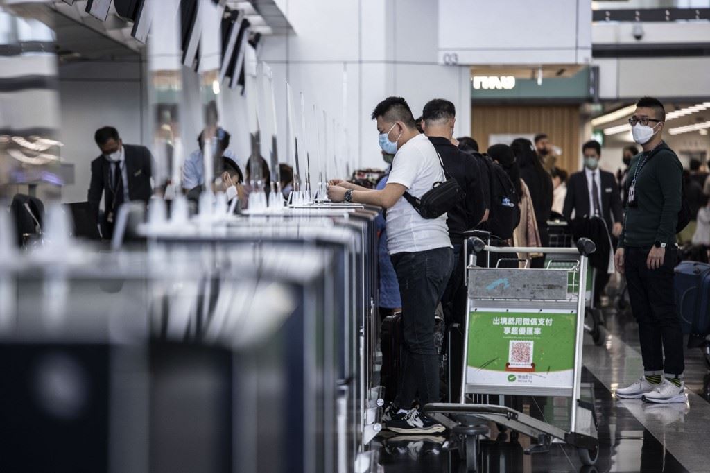 مسافرون يسجلون وصولهم لرحلتهم في مطار هونغ كونغ الدولي (5 ك2 2023، أ ف ب).